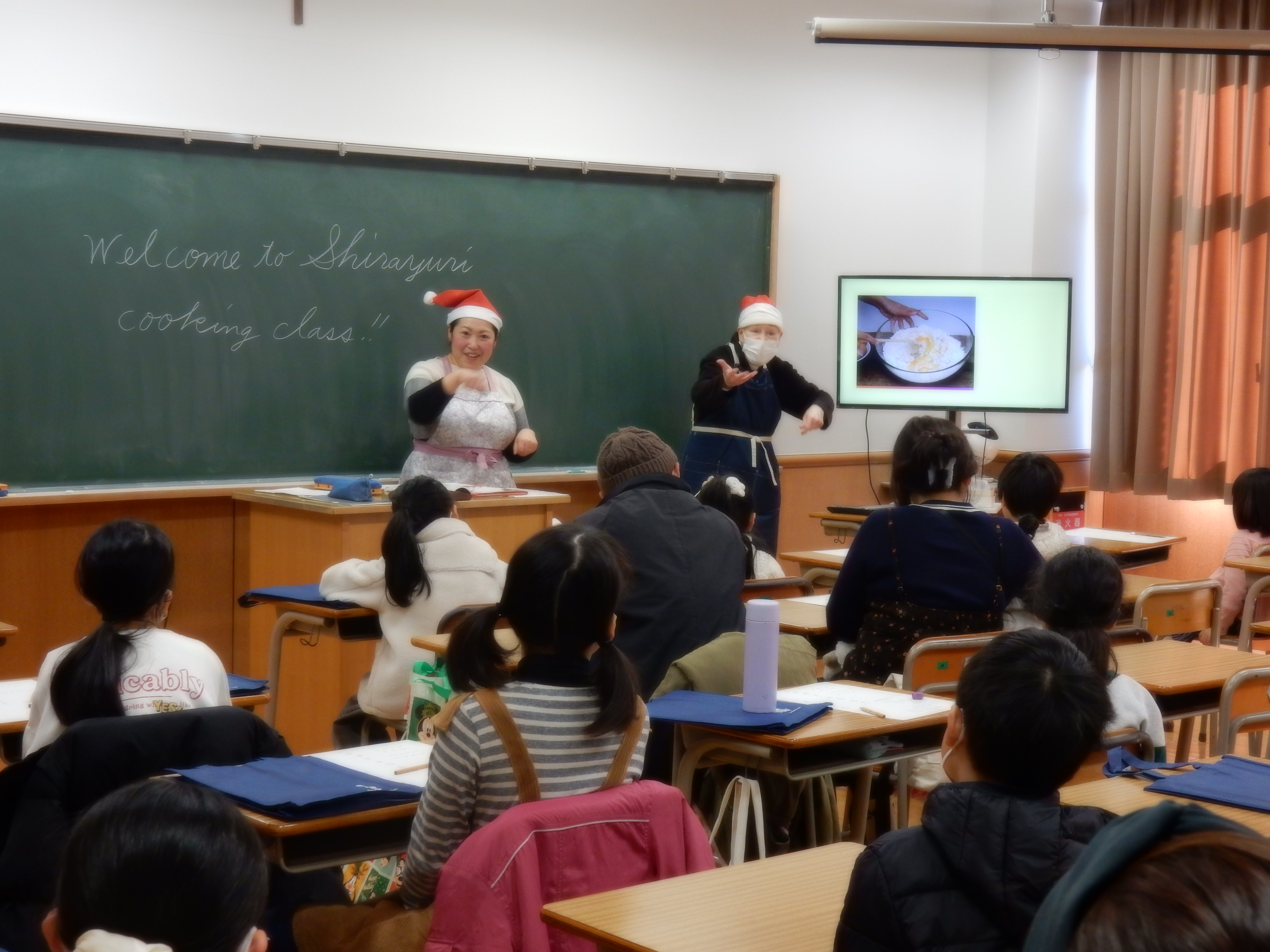 紫山探検隊『英語でCooking!』 午前中は、小学生を対象とした紫山探検隊『英語でCooking!』を実施しました。仙台白百合学園の英語の先生とお姉さんたちに見守られながら、「ケークサレ」をみんなで作り、ポトフと一緒にいただきました。 クッキングの合間には、英語のクイズや英語絵本の読み聞かせも行われ、親子で、家族で、友だち同士で、楽しみながら英語にふれる時間となりました。会場には子どもたちの笑顔と笑い声があふれ、心あたたまるひとときとなりました。 ともに祝うクリスマス クリスマスコンサート、クリスマスミサについては学園サイトに載せましたので、ご覧ください。