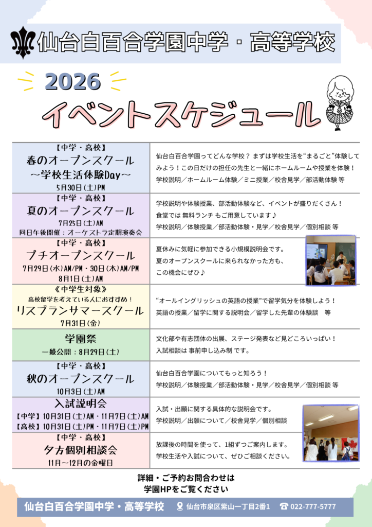 仙台白百合学園中学・高等学校の令和8年度学校イベント(予定)及び入試日等をご案内いたします。
